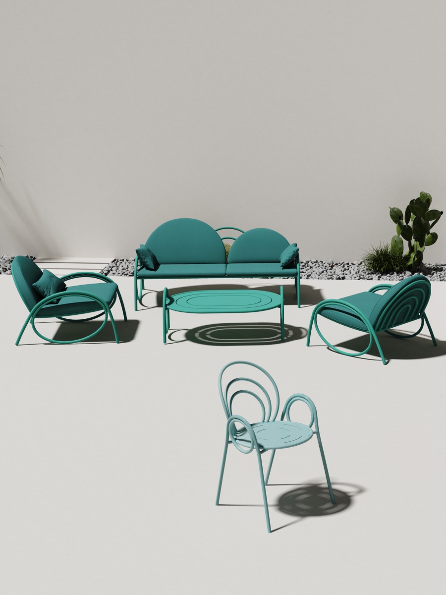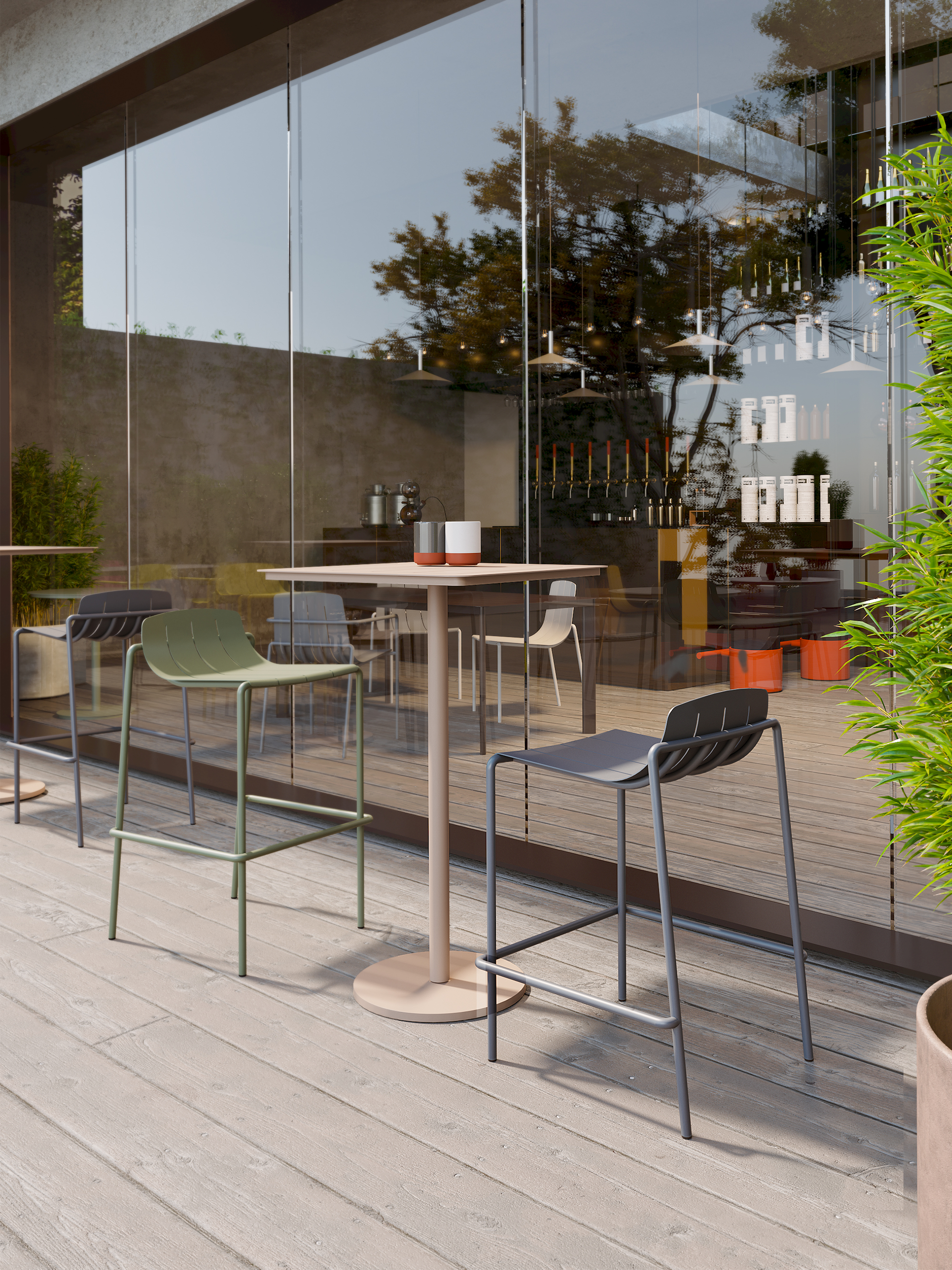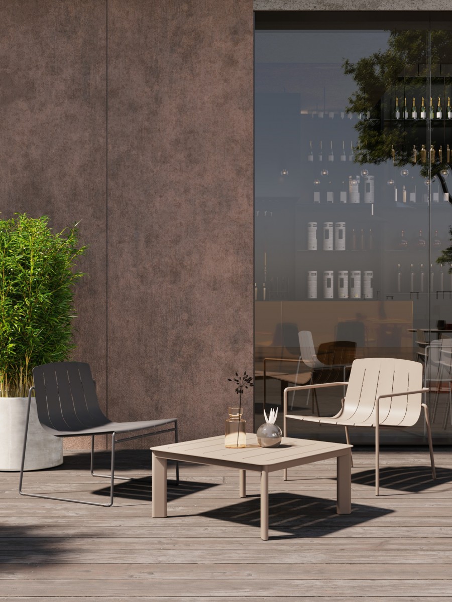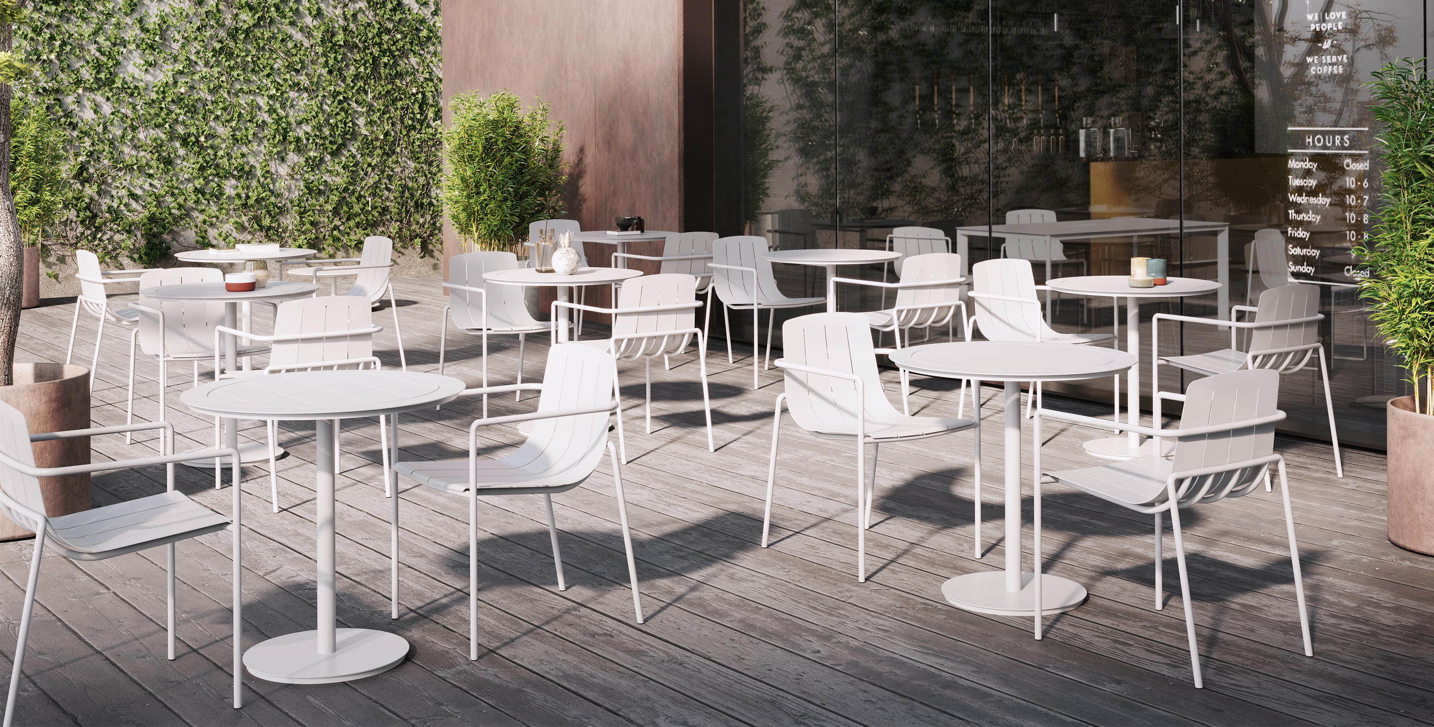 The seat of the chairs, loungers and stools of the Dasia line - with or without armrests - is fashioned from curved strips of powder coated aluminium and supported by a four-leg or sledge frame.